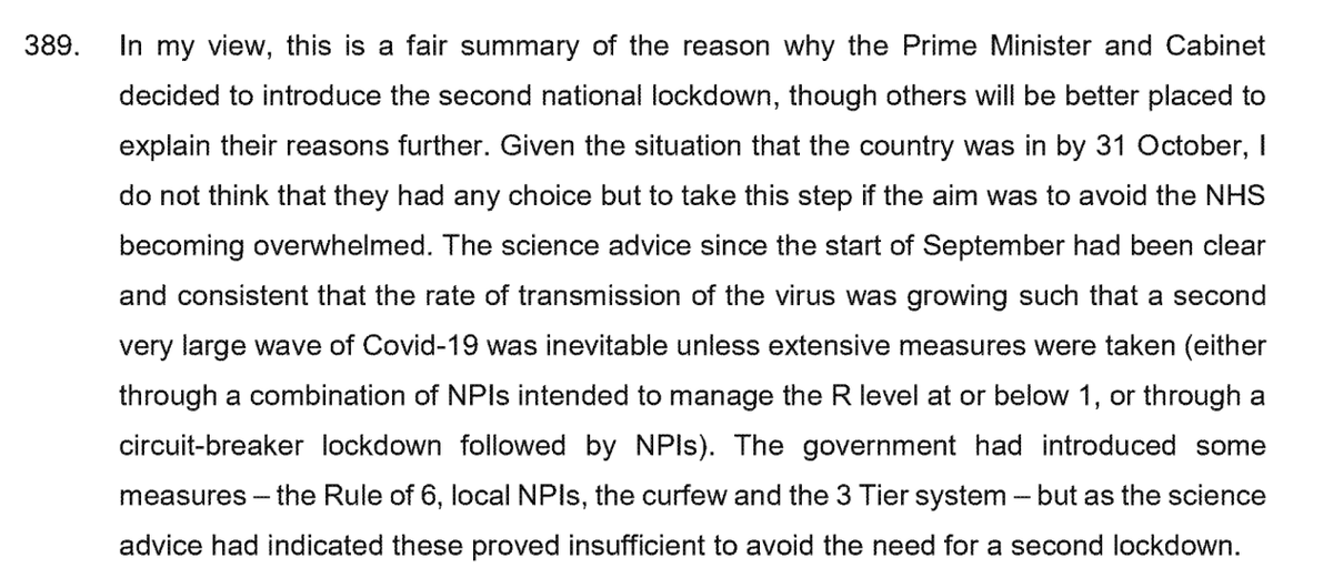 Was any other choice but to lockdown? Vallance doesn’t think so. In witness statement says “very large wave” of Covid was inevitable from start of Sept unless extensive measures taken. But rule of six, curfews, tiers were not enough “as the science advice had indicated”.