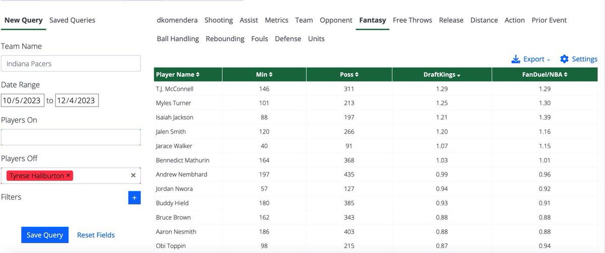 You can also filter by date to see what happens if a player is OUT. Here are the Pacers numbers when Haliburton missed on December 2nd