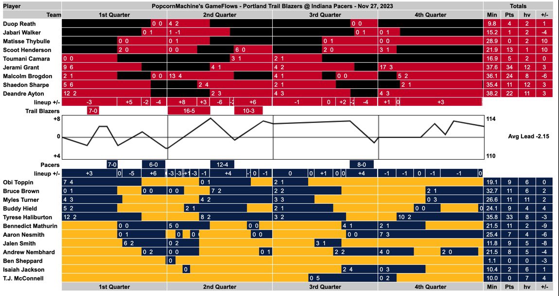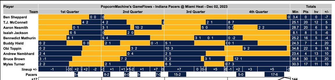 I use PopcornMachine for rotations. Here is an example of the Pacers rotation with a fully healthy team. You can see players +/-, minutes, and fouls