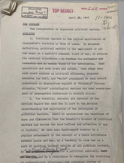 Timestamp 1:30-2:30 -- Here is George Kennan's 1948 memo "The Inauguration Of Organized Political Warfare" penned with lessons in mind from the CIA's rigging of the 1948 Italian election, which had just taken place 12 days earlier digitalarchive.wilsoncenter.org/document/georg…