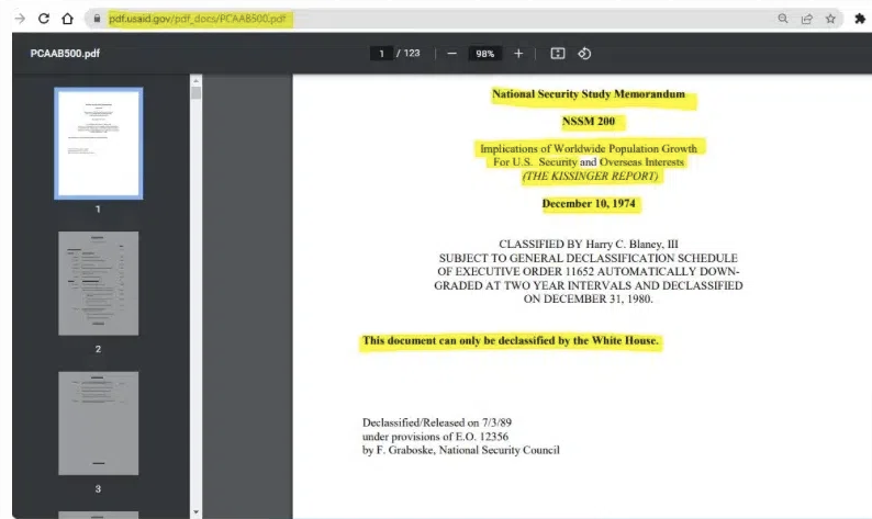 During his term as National Security Advisor in 1974, Kissinger drafted a top-secret report and plan to manage the world population, with the intention of testing the scheme on the populations of less developed countries in Asia and Africa before implementing it in the United States and Europe.