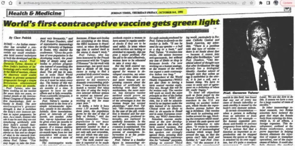 The Rockefellers got their wish seven years later. A birth control vaccine. In 1992, the same National Institute of Immunology in New Delhi invented it. Rockefeller research funding developed a vaccination that, when administered every six months, can prevent conception.