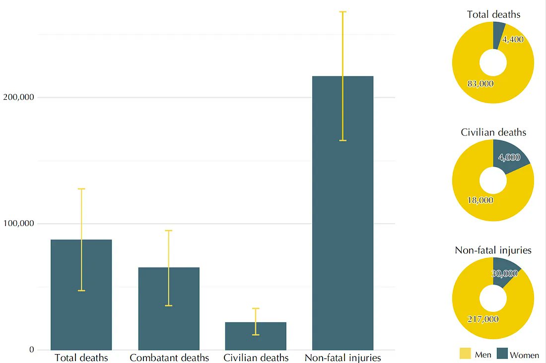 Se calla que eso se debe a que a los hombres les prohibieron huir; y que como consecuencia, el 96% de los muertos son hombres.