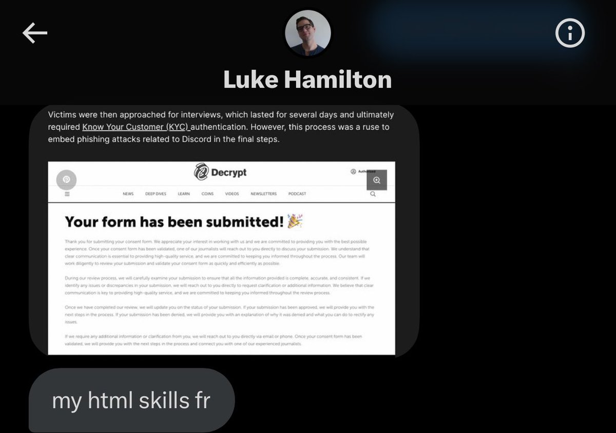 He works with other scammers to approach team members of crypto projects to trick them into joining a fake Decrypt Discord server in an elaborate attempt to steal their Discord token