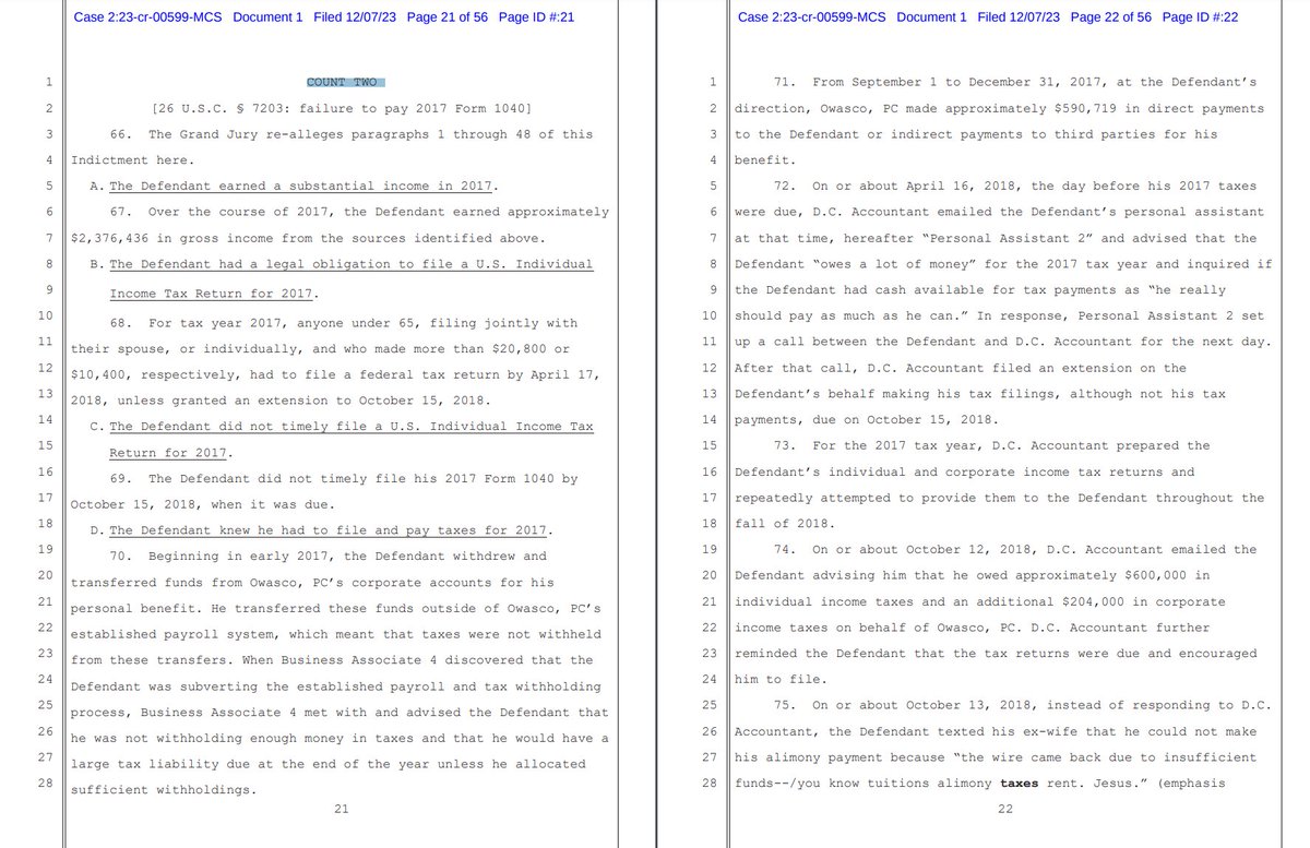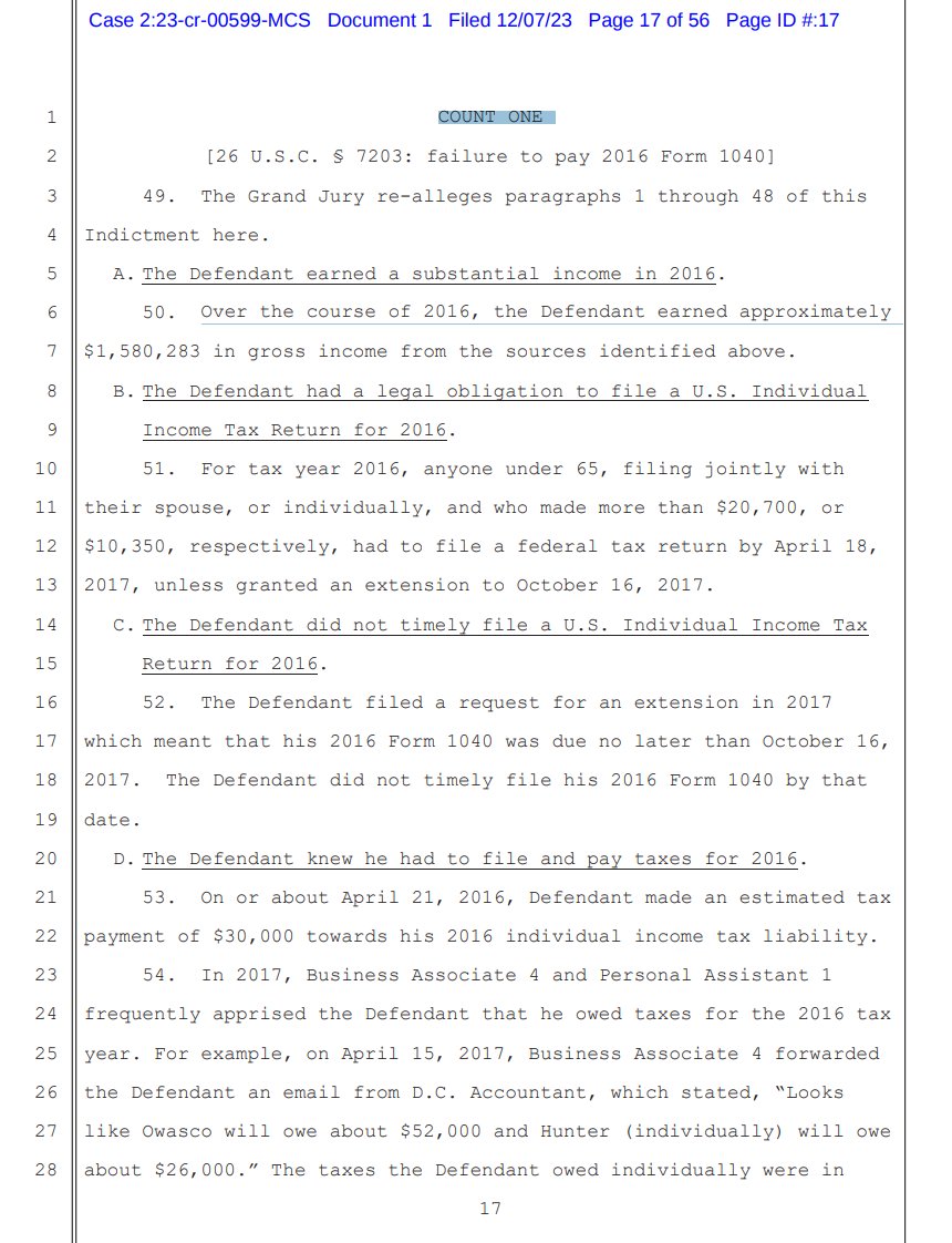 "During the calendar year 2017, the Defendant ROBERT HUNTER BIDEN had and received taxable income of $1,956,003, on which taxable income there was owing to the United States of America an income tax of $581,713...