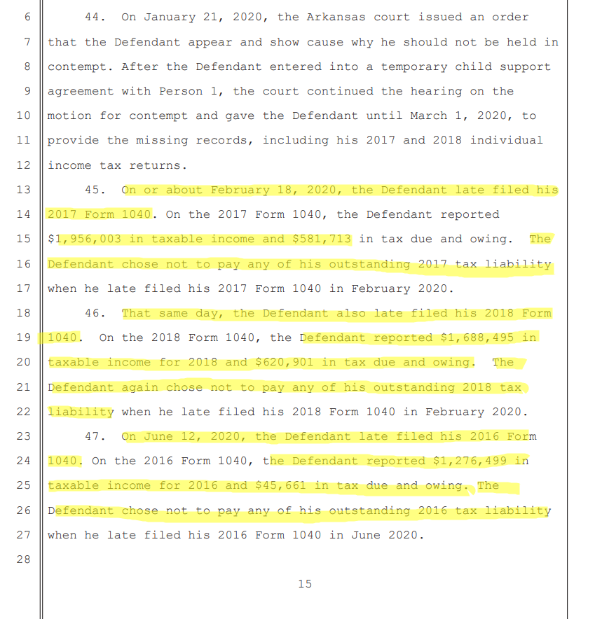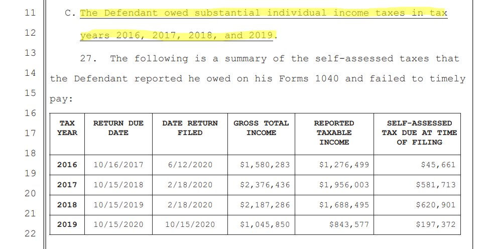 "June 12, 2020, the Defendant late filed his 2016 Form 1040... $1,276,499 in taxable income for 2016 and $45,661 in tax due and owing. The Defendant chose not to pay any of his outstanding 2016 tax liability"