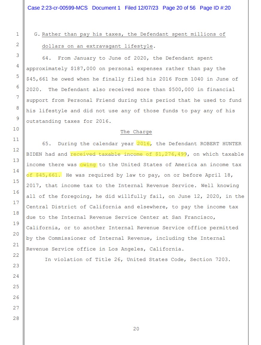 "During the calendar year 2016, the Defendant ROBERT HUNTER BIDEN had and received taxable income of $1,276,499, on which taxable income there was owing to the United States of America an income tax of $45,661...