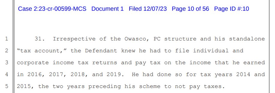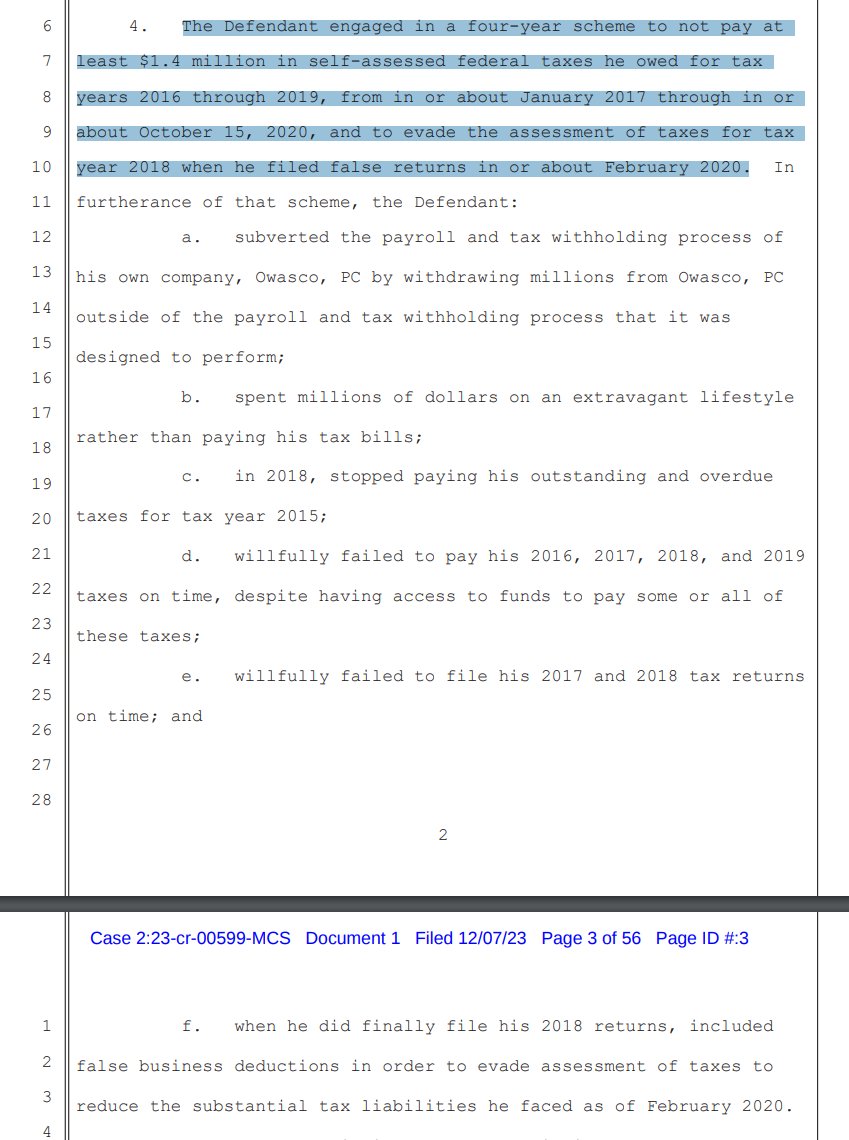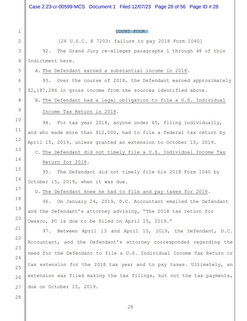 Well knowing all of the foregoing, he did willfully fail on April 17, 2018, and on February 18, 2020, in the Central District of California and elsewhere, to pay the income tax due."