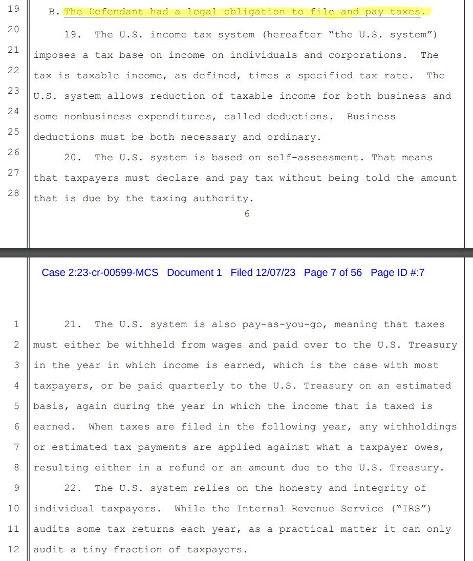 Weiss goes on to list all the times Hunter paid his taxes in a timely manner, demonstrating that Hunter knew what his tax obligations were and how to meet them, but made purposeful, knowing efforts to dodge them in various instances.