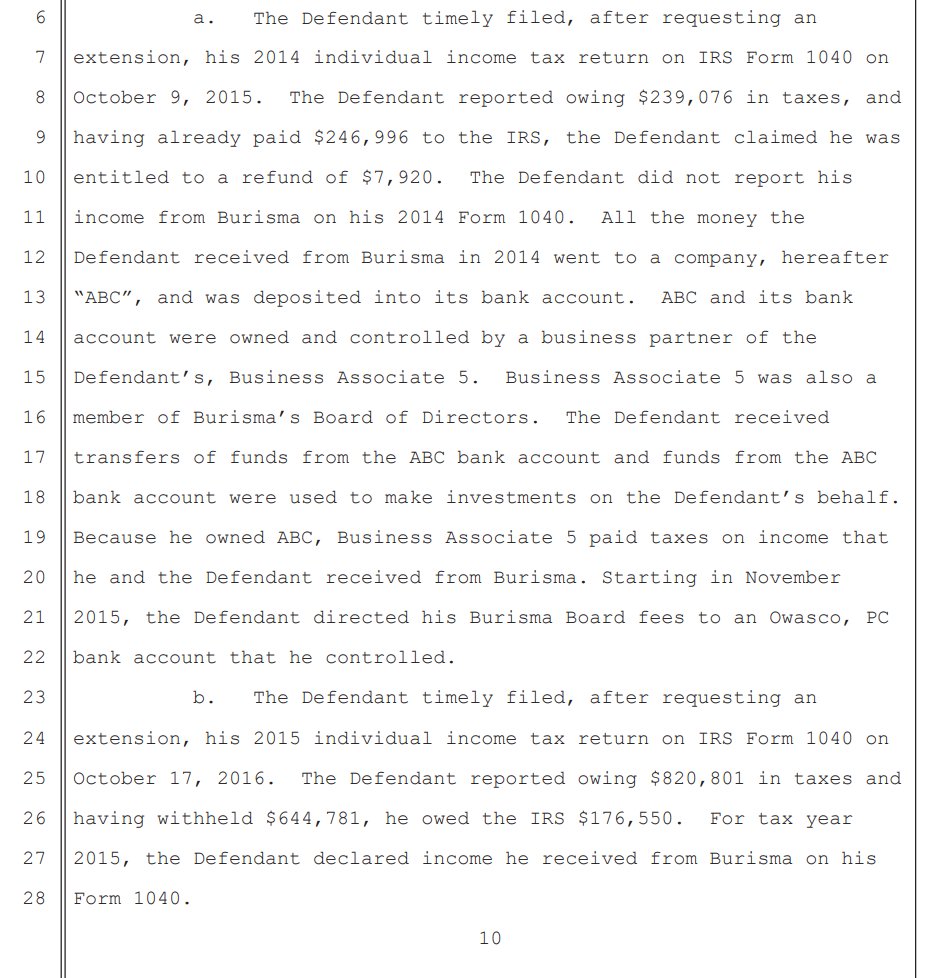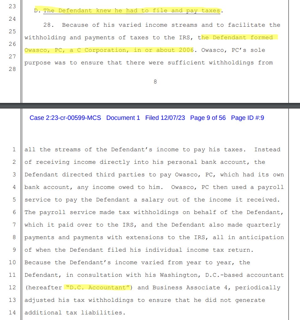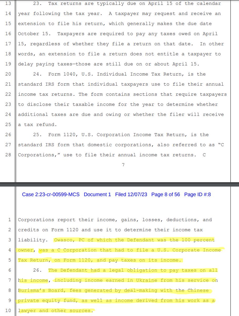 "Owasco, PC of which the Defendant was the 100 percent owner, was a C Corporation that had to file a U.S. Corporate Income Tax Return, on Form 1120, and pay taxes on its income. 26. The Defendant had a legal obligation to pay taxes on all his income, including income earned in Ukraine from his service on Burisma’s Board, fees generated by deal-making with the Chinese private equity fund, as well as income derived from his work as a lawyer and other sources."