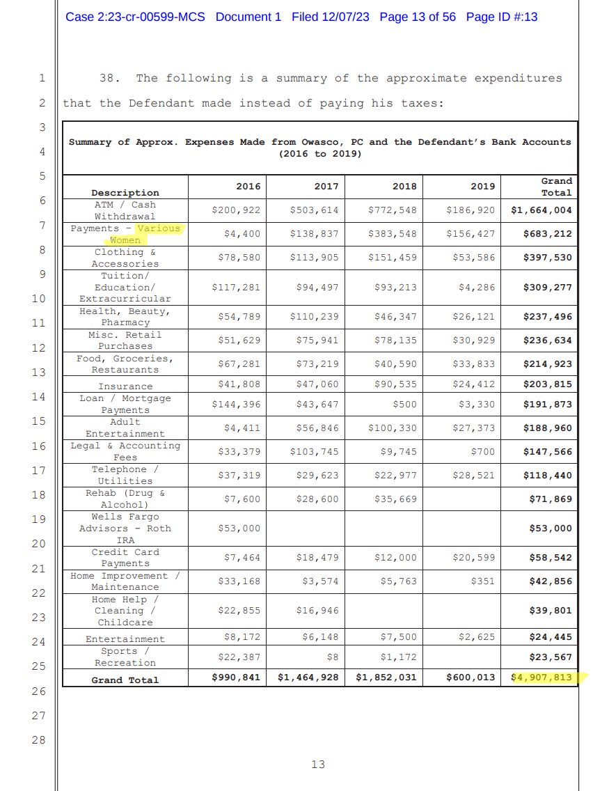 Summary of Approx. Expenses Made from Owasco, PC and the Defendant’s Bank Accounts 2016-2019.