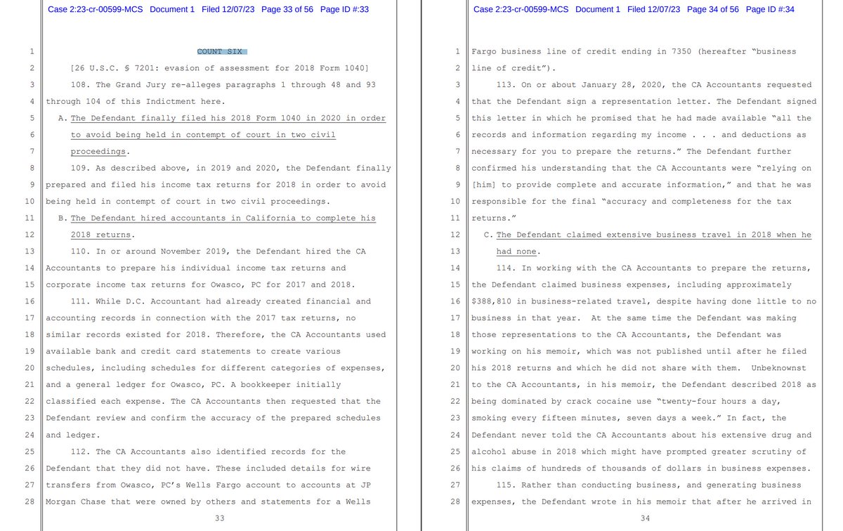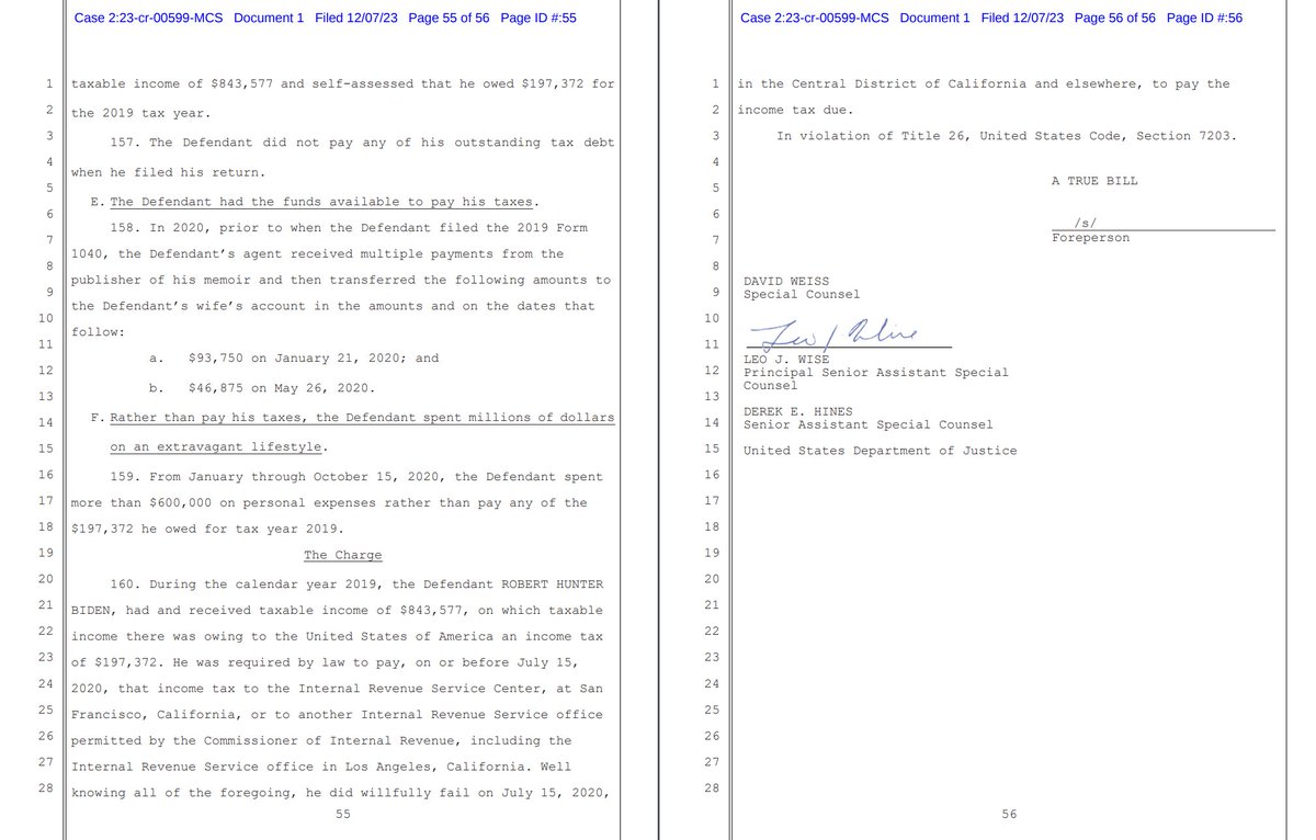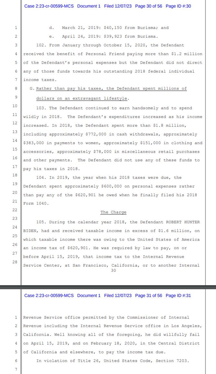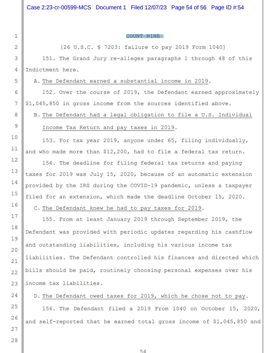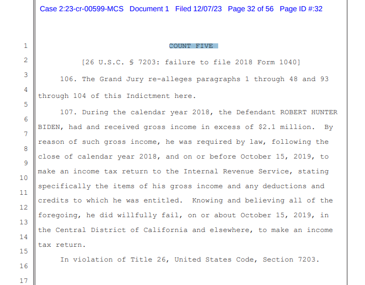 ...the Defendant ROBERT HUNTER BIDEN, had and received taxable income in excess of $1.6 million, on which taxable income there was owing to the United States of America an income tax of $620,901...