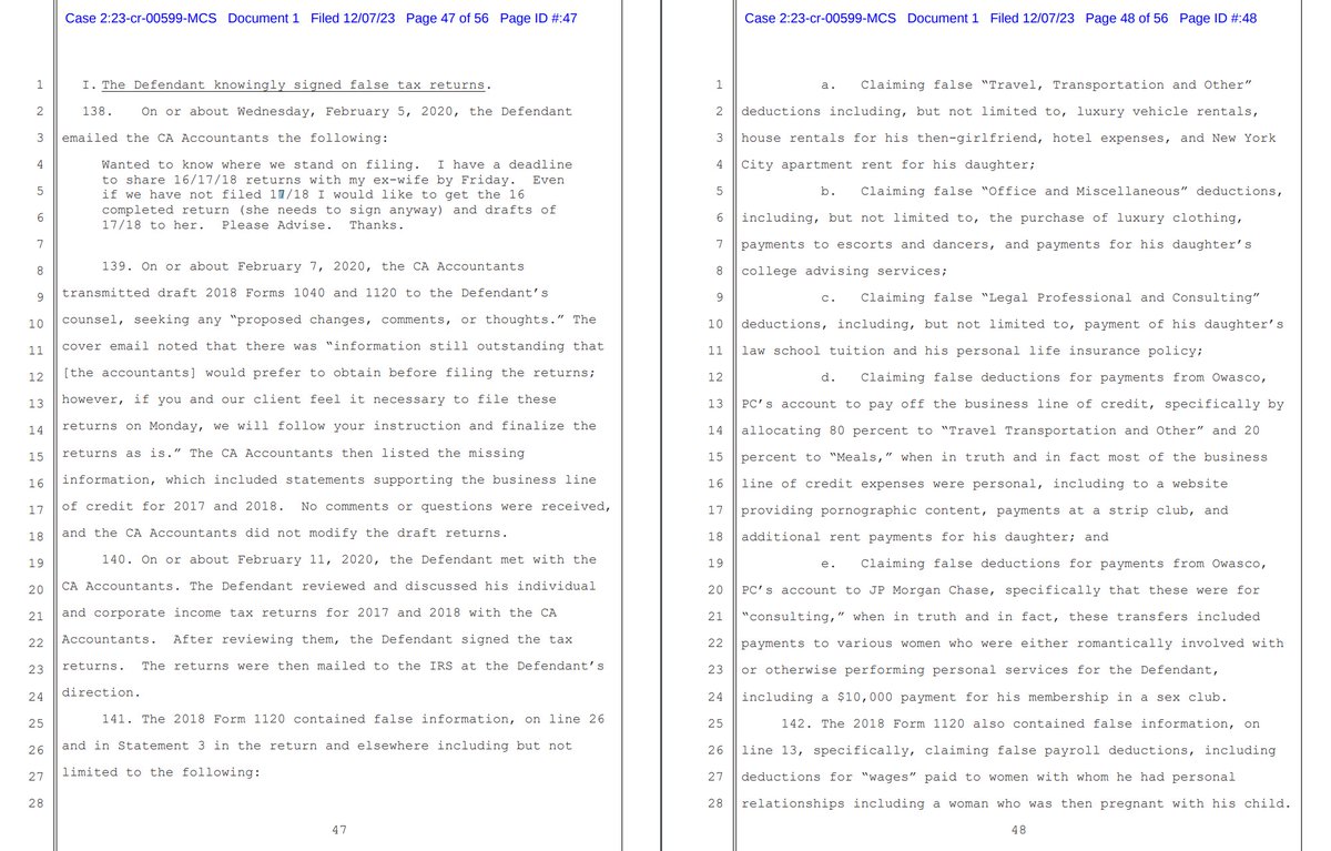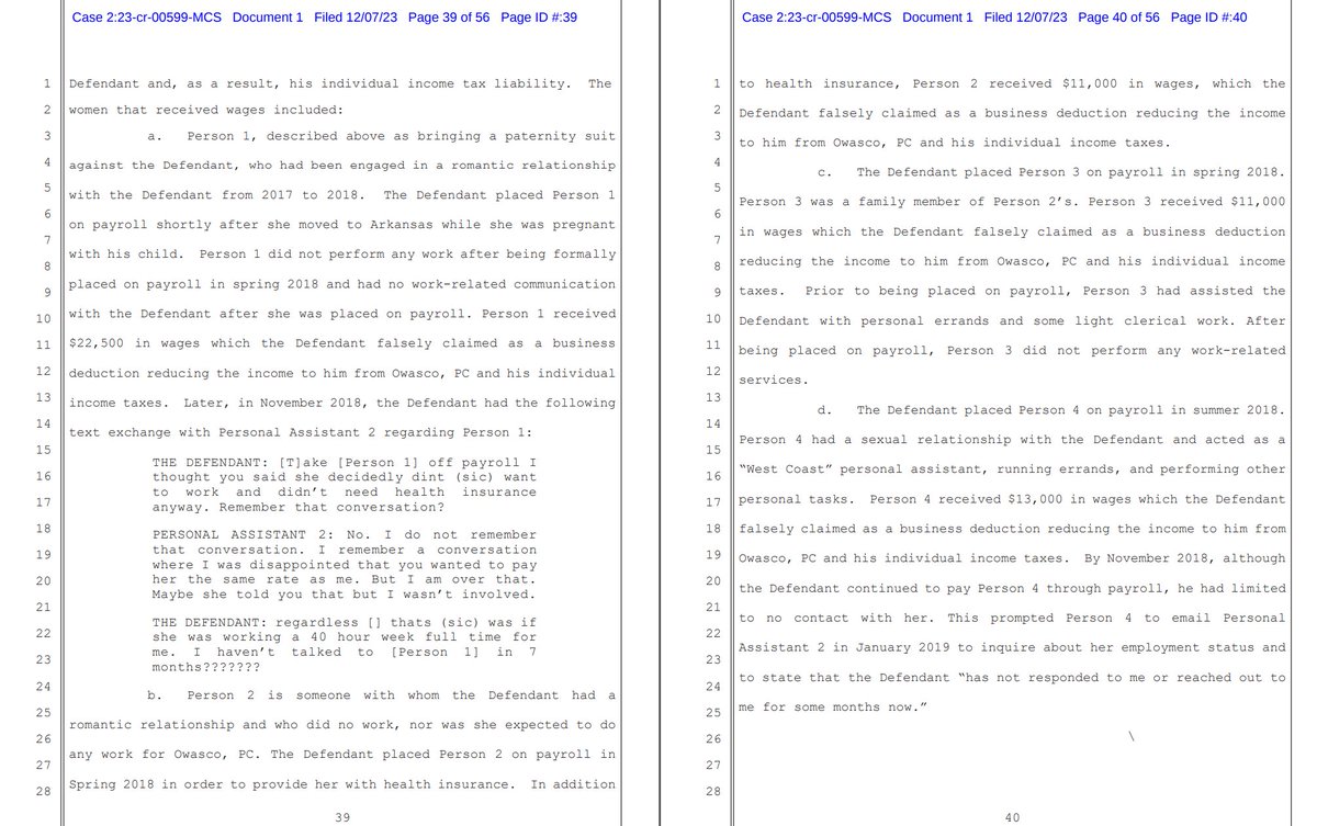 "The Defendant falsely claimed that money paid to women with whom he had personal relationships was wages, reducing his tax burden."