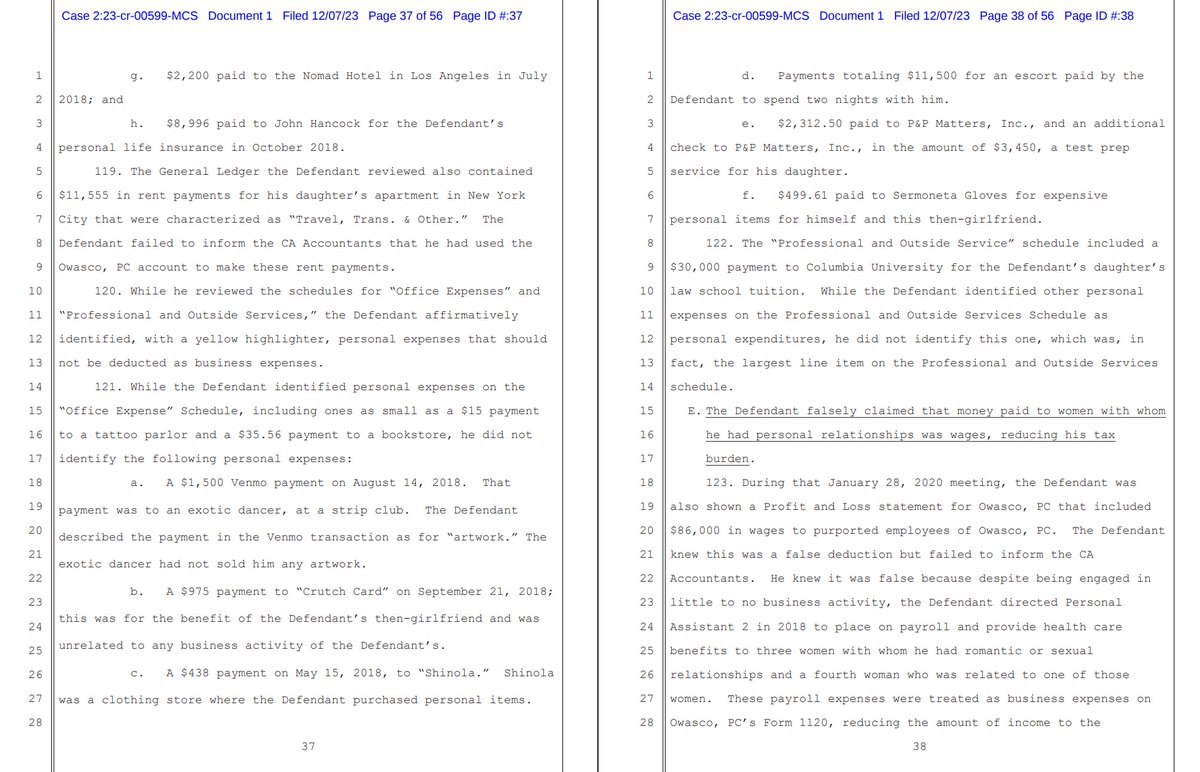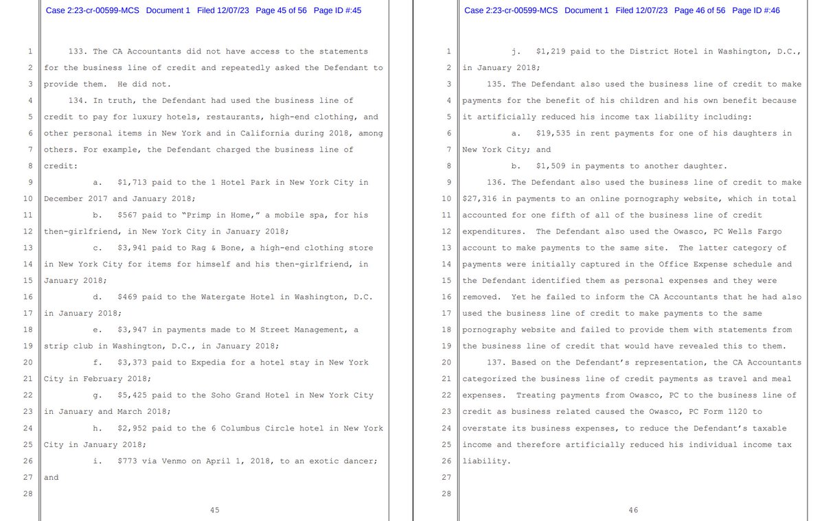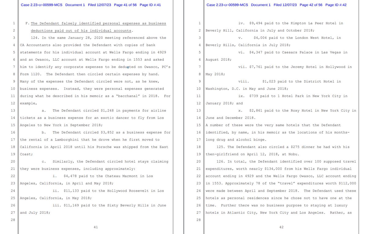 And the Defendant specifically described his stays in various luxury hotels in California and private rentals, and expenses related to them..."