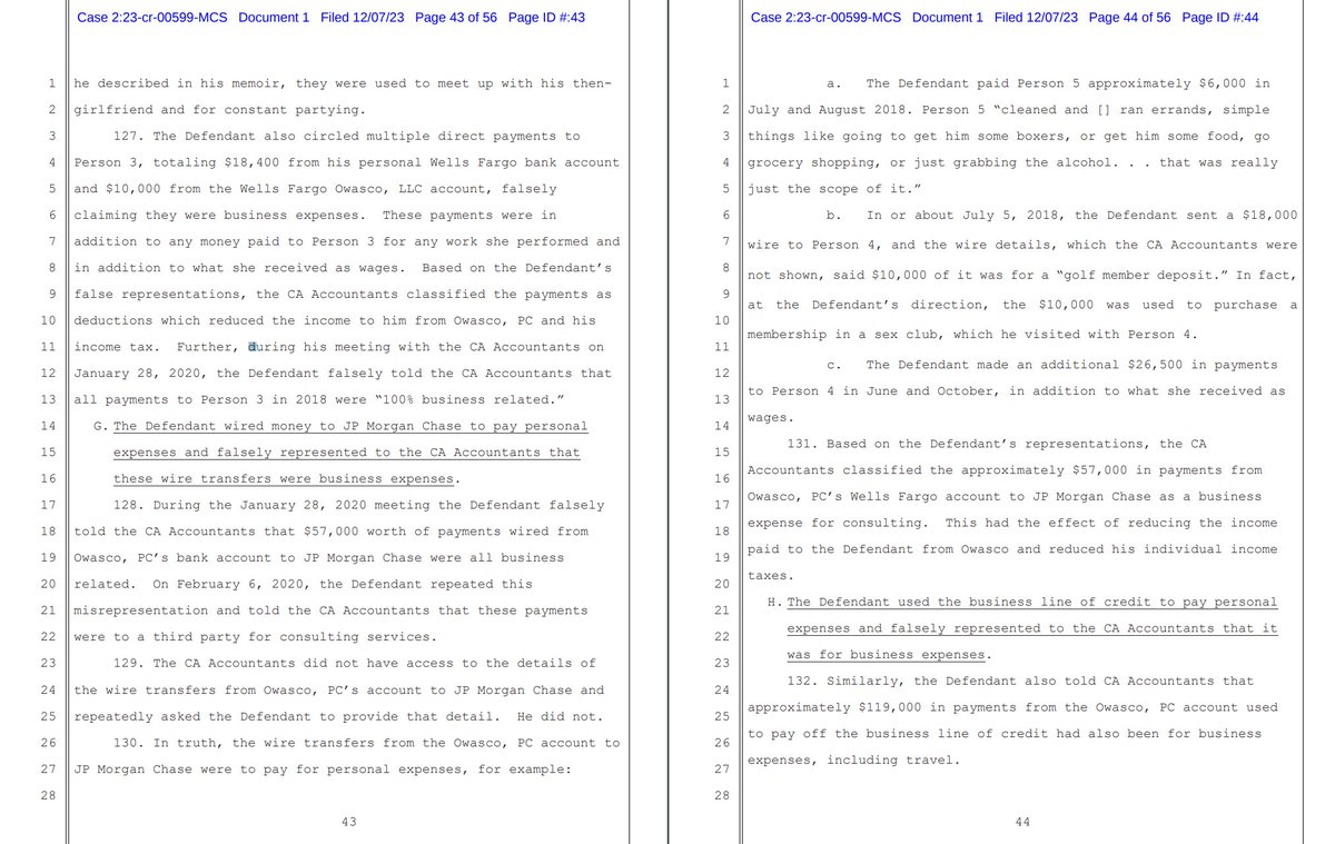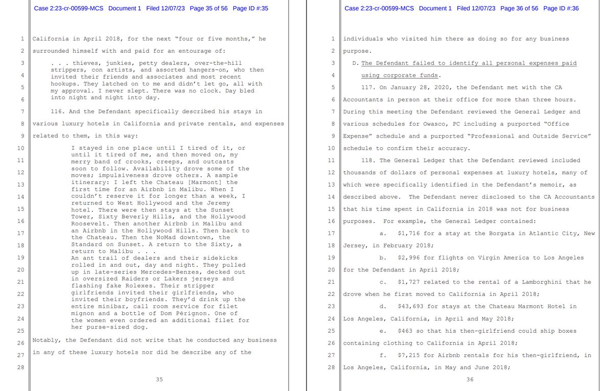 "Rather than conducting business, and generating business expenses, the Defendant wrote in his memoir that after he arrived in California in April 2018, for the next “four or five months,” he surrounded himself with and paid for an entourage of: