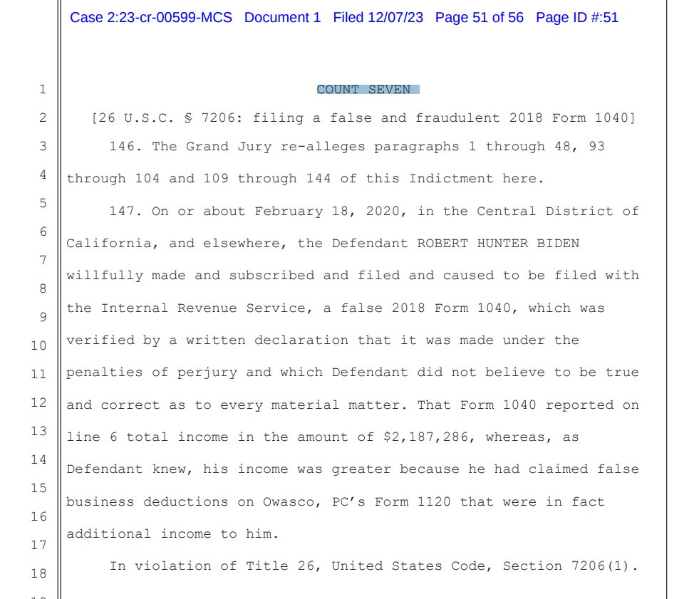 "On or about February 18, 2020, in the Central District of California, and elsewhere, the Defendant ROBERT HUNTER BIDEN willfully made and subscribed and filed and caused to be filed with the Internal Revenue Service, a false 2018 Form 1040"