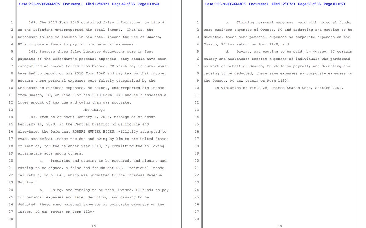 "From on or about January 1, 2018, through on or about February 18, 2020, in the Central District of California and elsewhere, the Defendant ROBERT HUNTER BIDEN, willfully attempted to evade and defeat income tax due and owing by him to the United States of America, for the calendar year 2018"