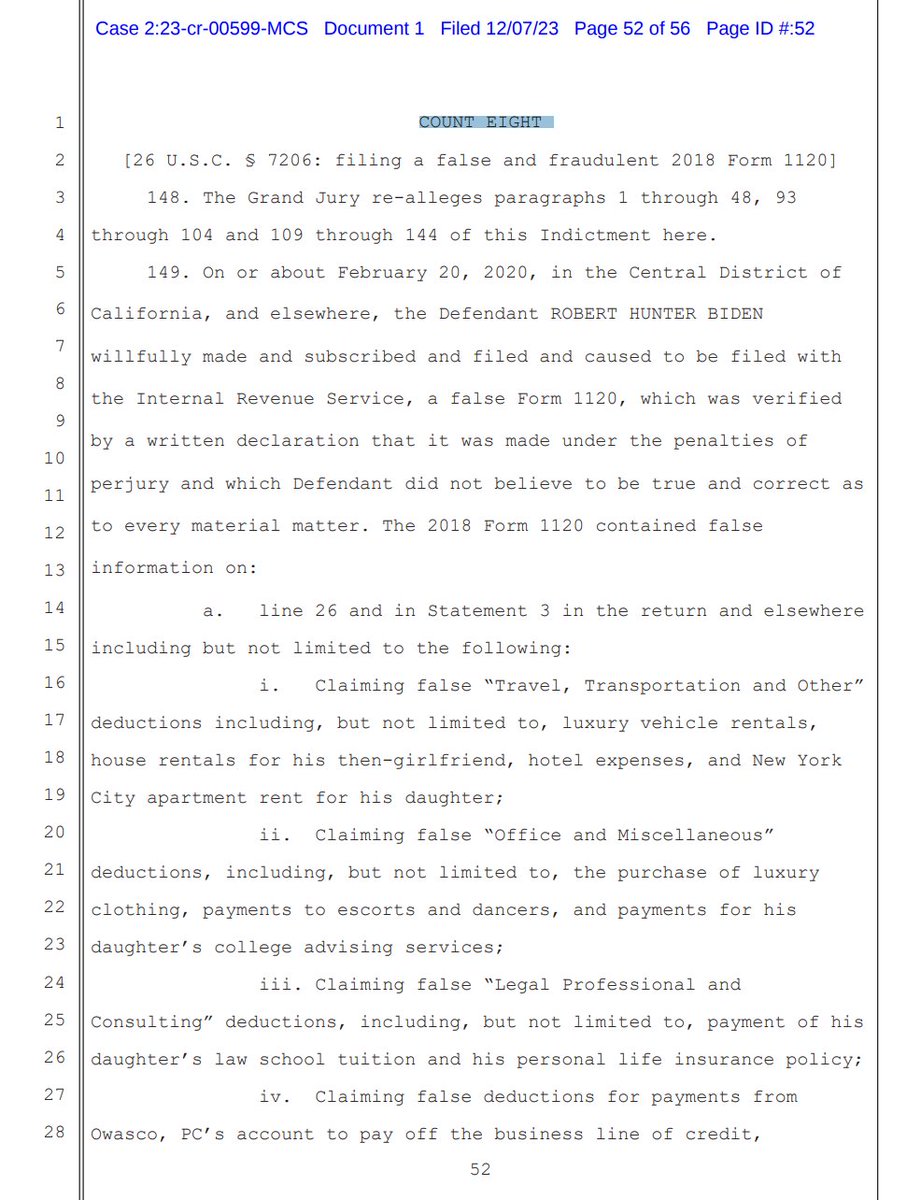 "On or about February 20, 2020, in the Central District of California, and elsewhere, the Defendant ROBERT HUNTER BIDEN willfully made and subscribed and filed and caused to be filed with the Internal Revenue Service, a false Form 1120"