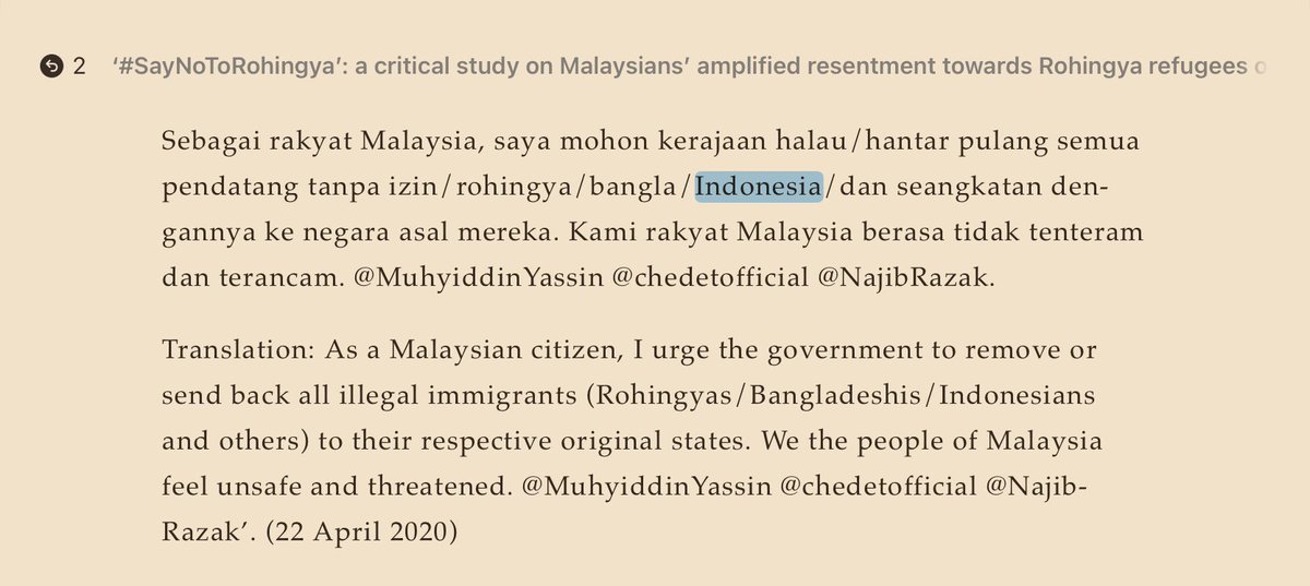 Ini beberapa bukti sentimen ultranasionalis dari Malaysia yang jg menargetkan pekerja Indonesia selain pengungsi Rohingya. Lihat nama Najib Razak juga dibawa-bawa utk penolakan ini. Semua ini ada di penelitian ini