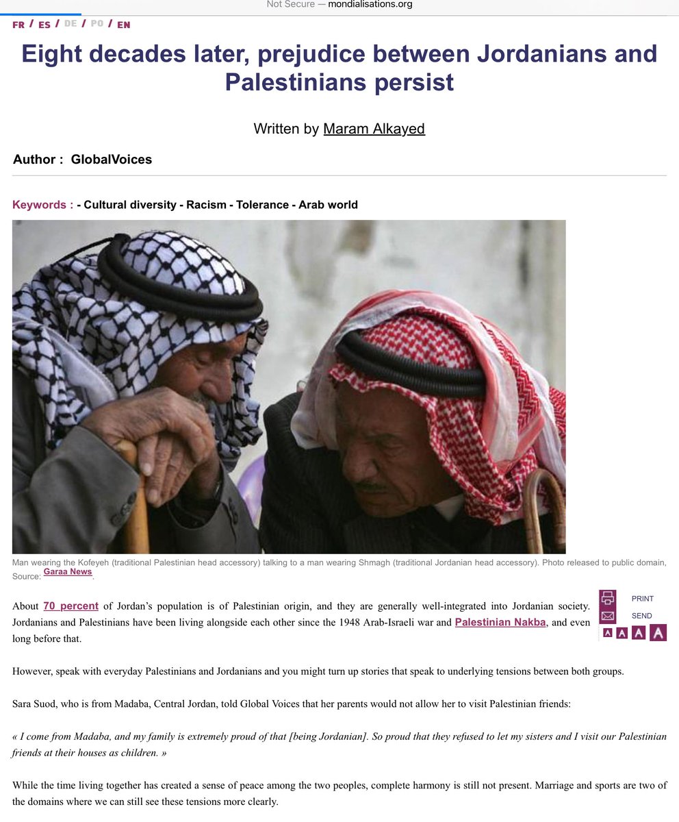 Org Palestina sampai sekarang mengalami prejudis yg berlangsung selama 80 tahun dari orang Jordan meskipun mrk scr umum baik, bahkan Ratu2 kerajaan Jordan selalu dari org Palestina spt Queen Rania