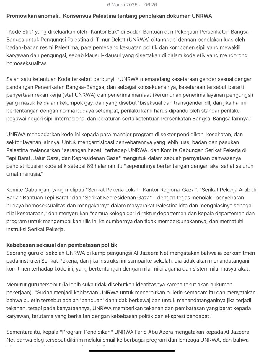 kita baca bbrp berita dari Palestina, September 2023. Penolakan masif masyarakat Palestina, aktivis dan serikat pekerja thdp edaran & program UNRWA yg mendukung LGBT