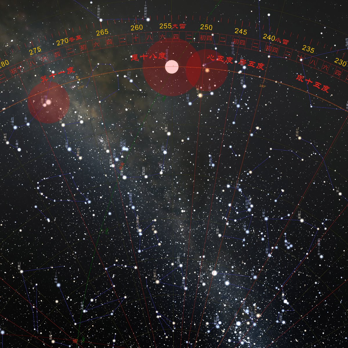 今年12月7日,“大雪”交节,太阳周年视运动位置循行到了黄经255°,位于二十八宿的尾宿五度。