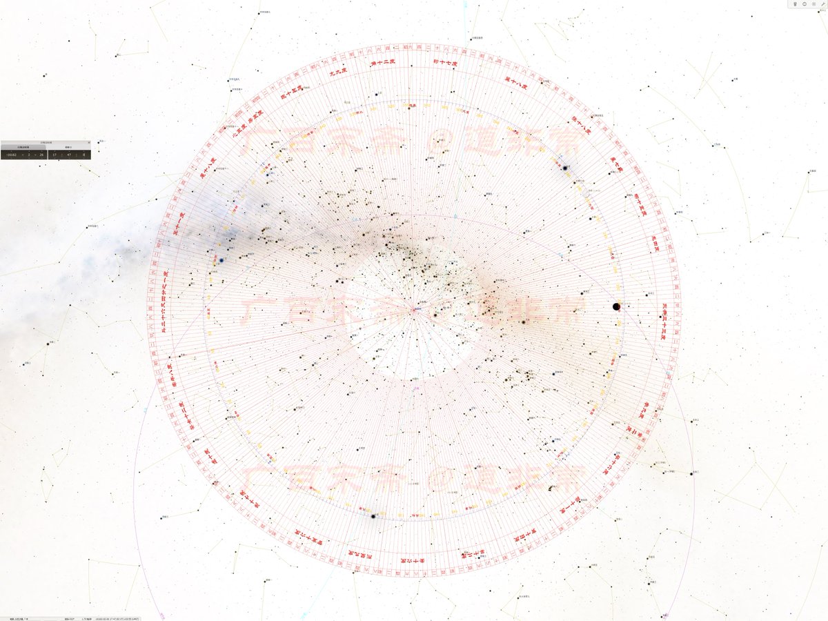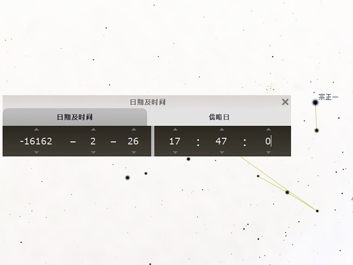 两位优秀的程序员朋友,根据我的提示,解除了 stellarium 观测时间的限制,顺利在我推断的观测地点,发现公元前117835年2月25日,日落时刻,冬至交节,木星和牛宿一靠近黄经60°。 Image