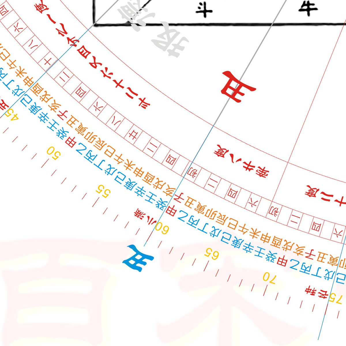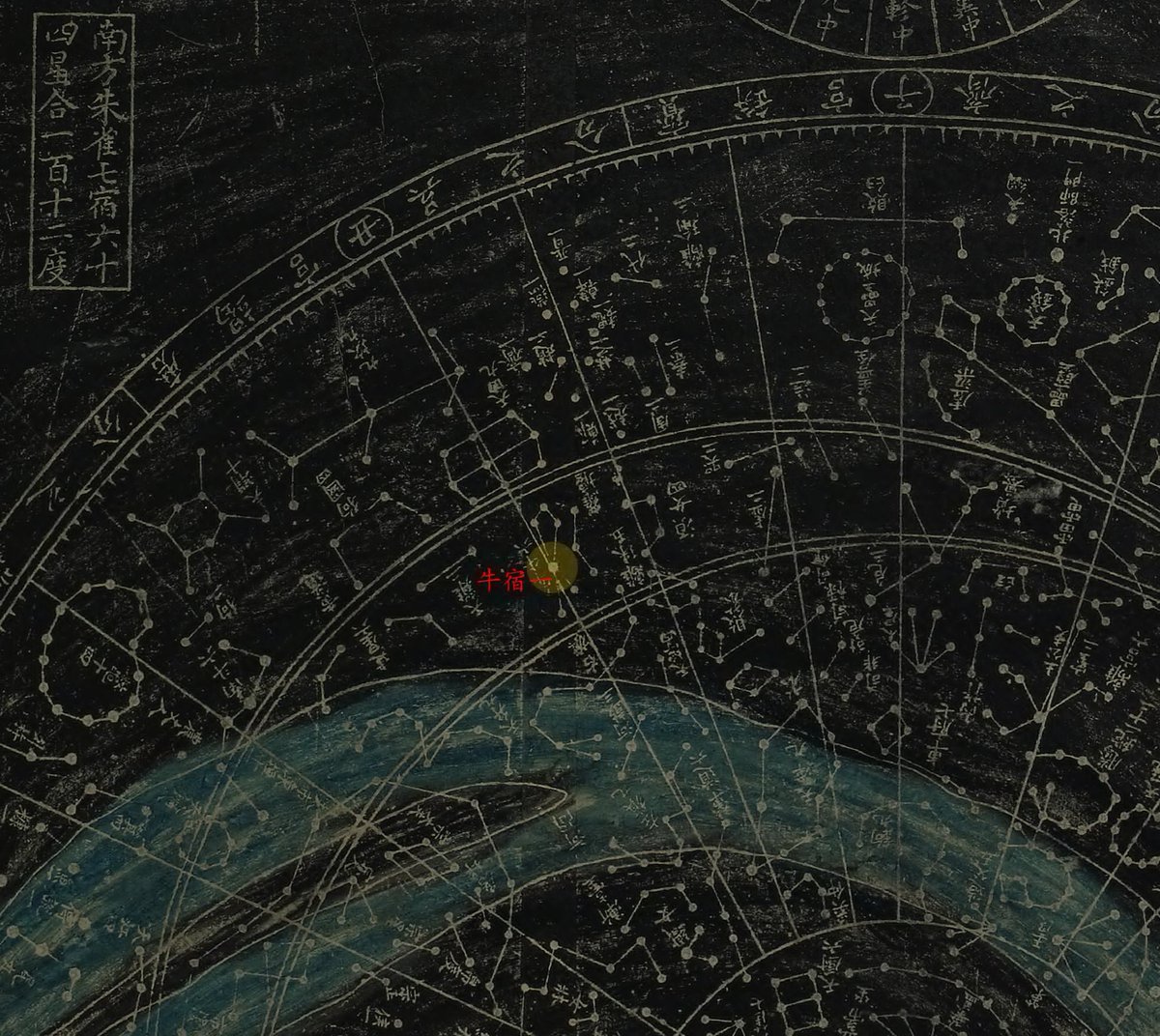 我把角宿的起点线放在角宿一,宿度线一度一度地逆时针划拉过去,划过去,划到了牛宿的起点牛宿一。