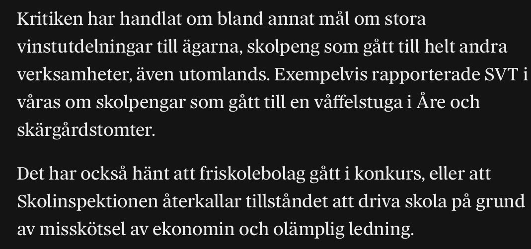 Så här står det i artikeln - regeringen har uppmärksammats på att 1) skolföretagen har använt vinsten från sin verksamhet för att köpa grejer som kanske inte omedelbart har med skola att göra, och 2) det har hänt att skolor har gått i konkurs.