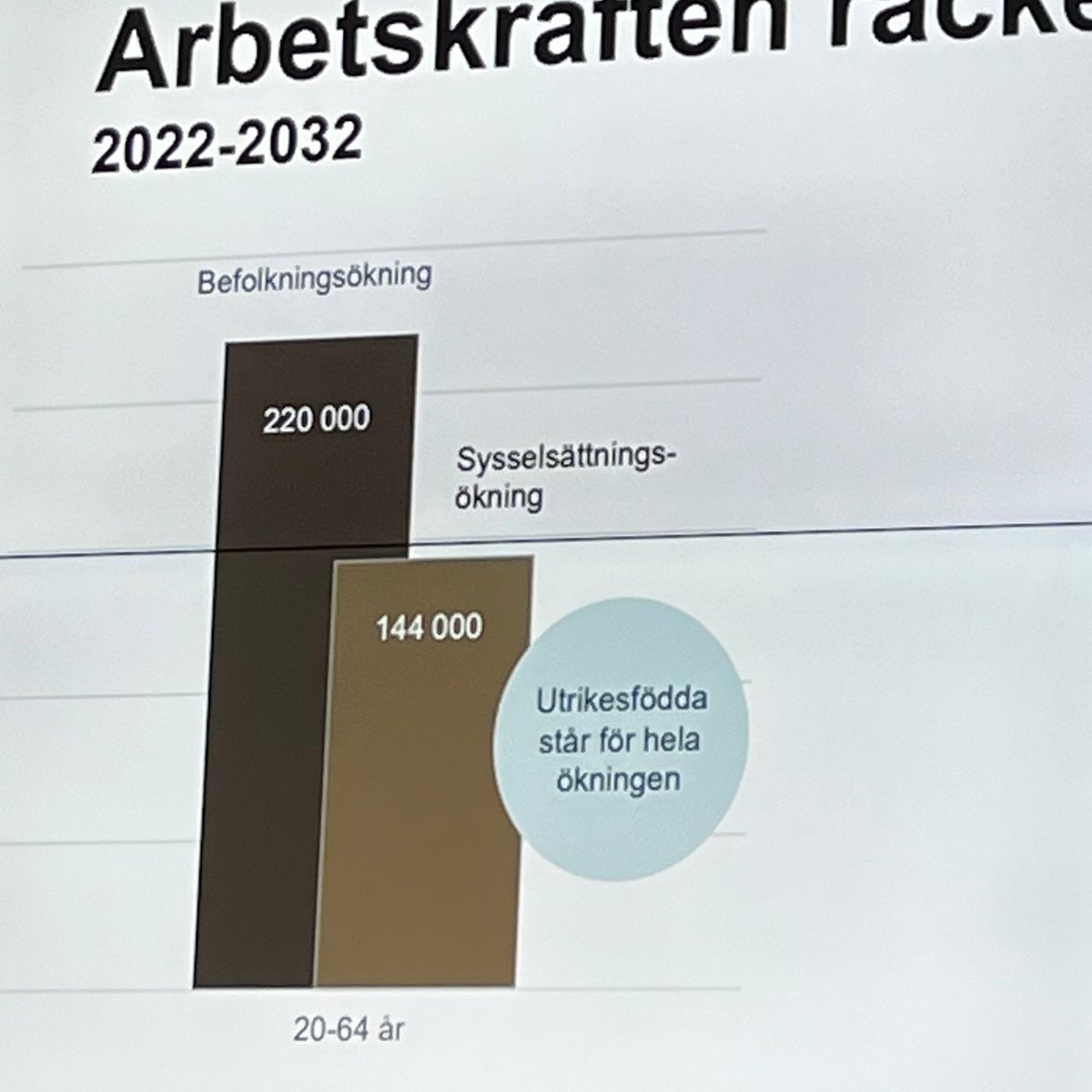 Vi börjar till vänster. Om jag fattat det här rätt (och det är inte säkert) så innebär den mörkbruna stapeln att 2032 är vi 220K fler svenskar i åldrarna 20-64 jfrt m -22. Den ljusbruna stapeln är hur många av dem som förväntas arbeta som huvudsaklig syssla.