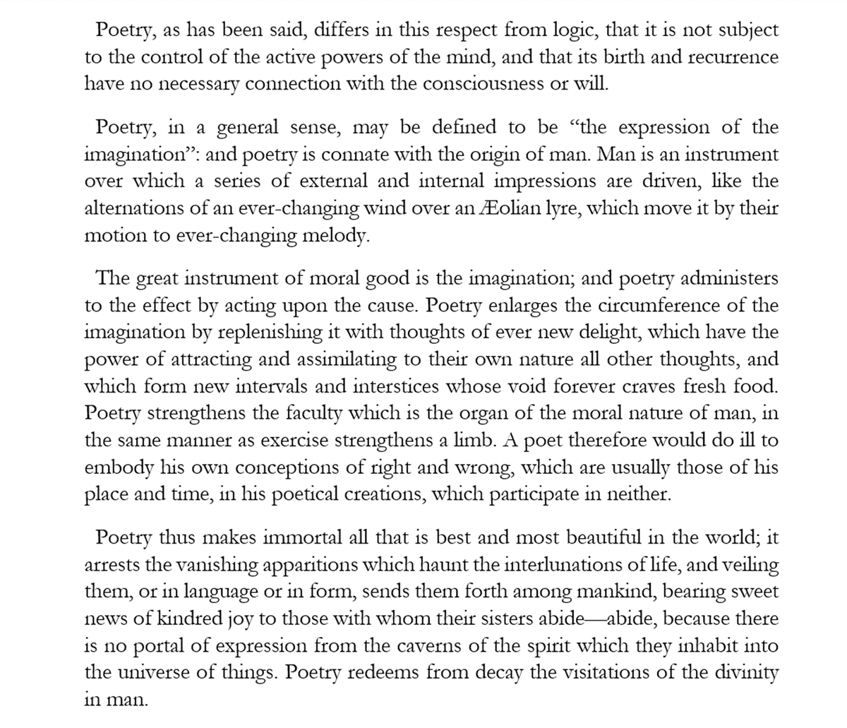 Thus said Shelley himself in his glorious "Defence of Poetry":