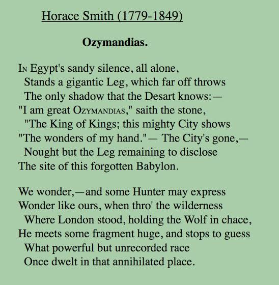All Shelley needed was the *thought* of that statue of once-glorious Ramesses, ruined and unobserved in the desert, and Ozymandias simply came to him.