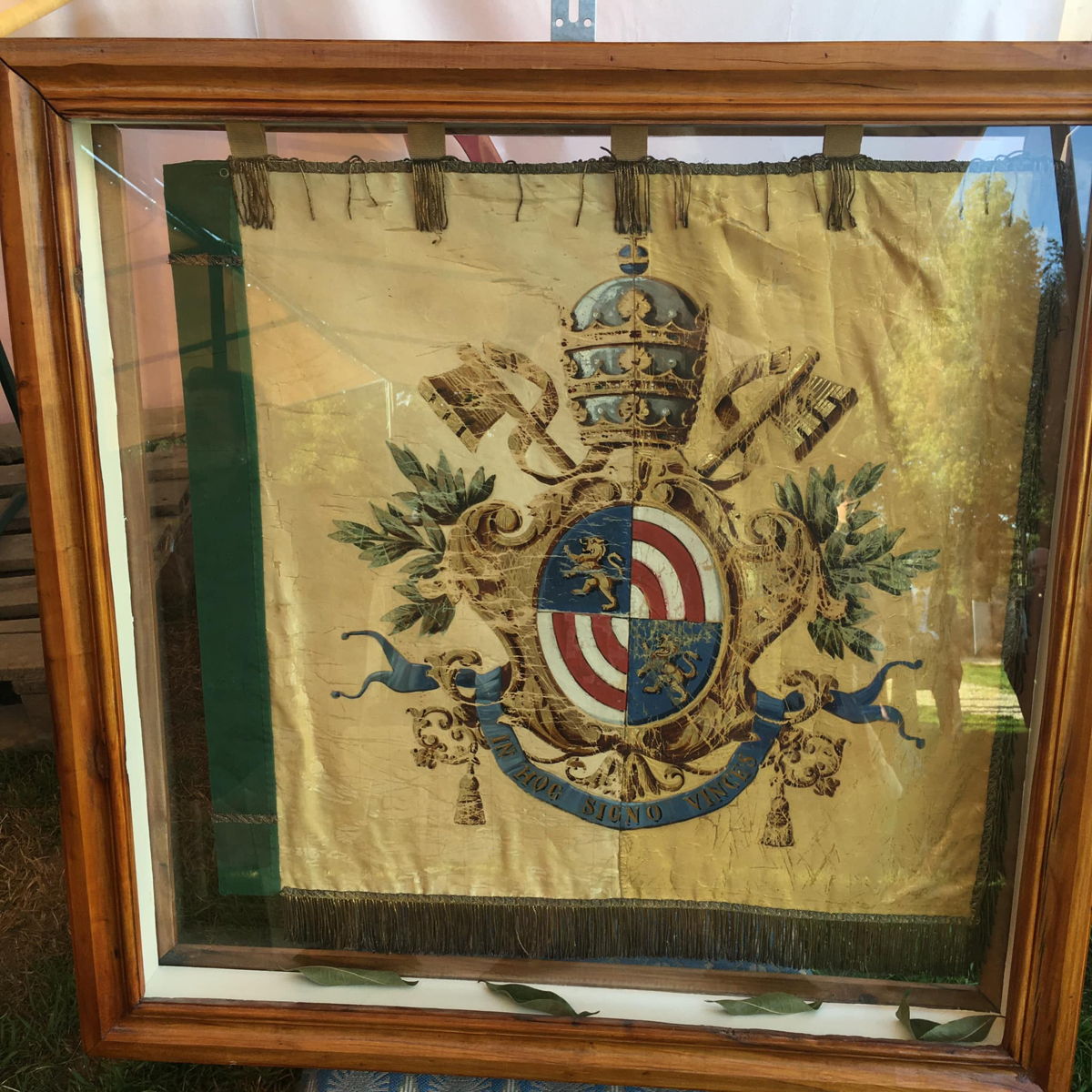 On one side of the flag is Bl. Pope Pius IX coat of arms. The reverse bore the general’s arms and below it the arms of 4 Guides (leaders), which were of noble French descent. The attached ribbon also bore these two arms.