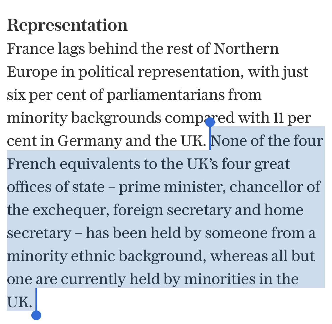 France is "racist" because it lags the minority political representation of other European nations forcing demographic change. By contrast, 75% of the UK's top four political positions are minority-held just 75 years after that nation multiculturalized. Sounds like a conquering.