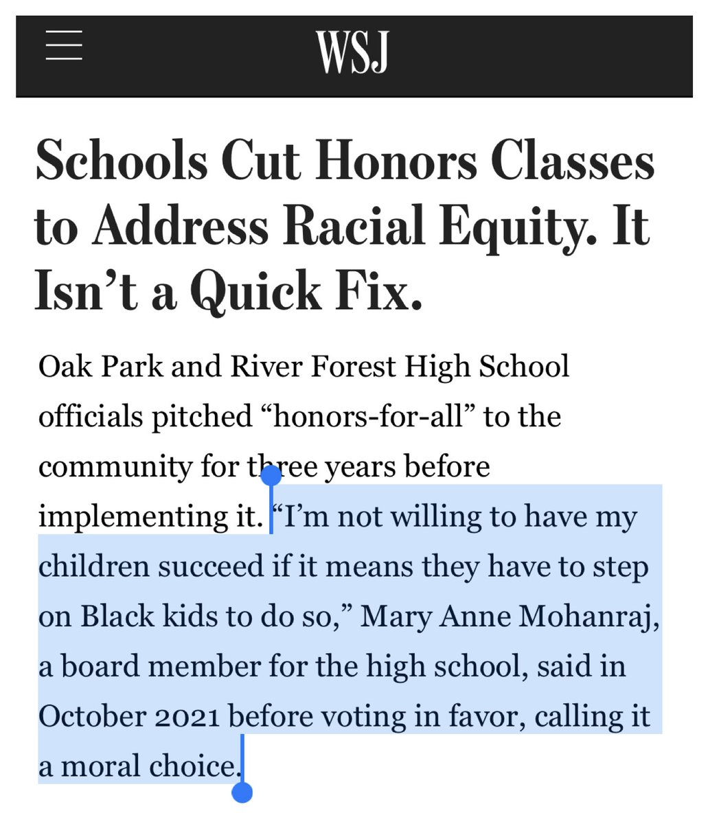 A mom calling for honors classes to be cut said, "I'm not willing to have my children succeed if it means they have to step on Black kids to do so." She called that the moral choice.