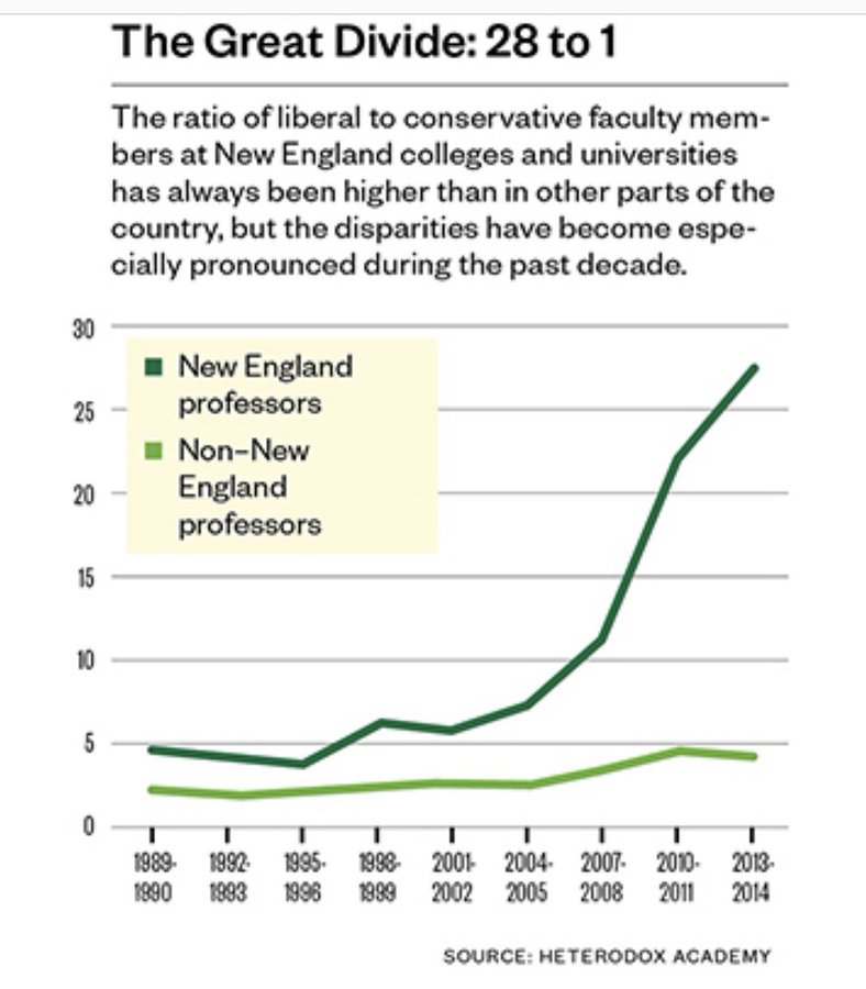 The liberal-conservative divide is far greater among university faculties than it is the general public. In New England, liberal college professors outnumber conservative ones 28 to 1. The Left seized university administrations and consciously hire only liberal professors. [2/3]