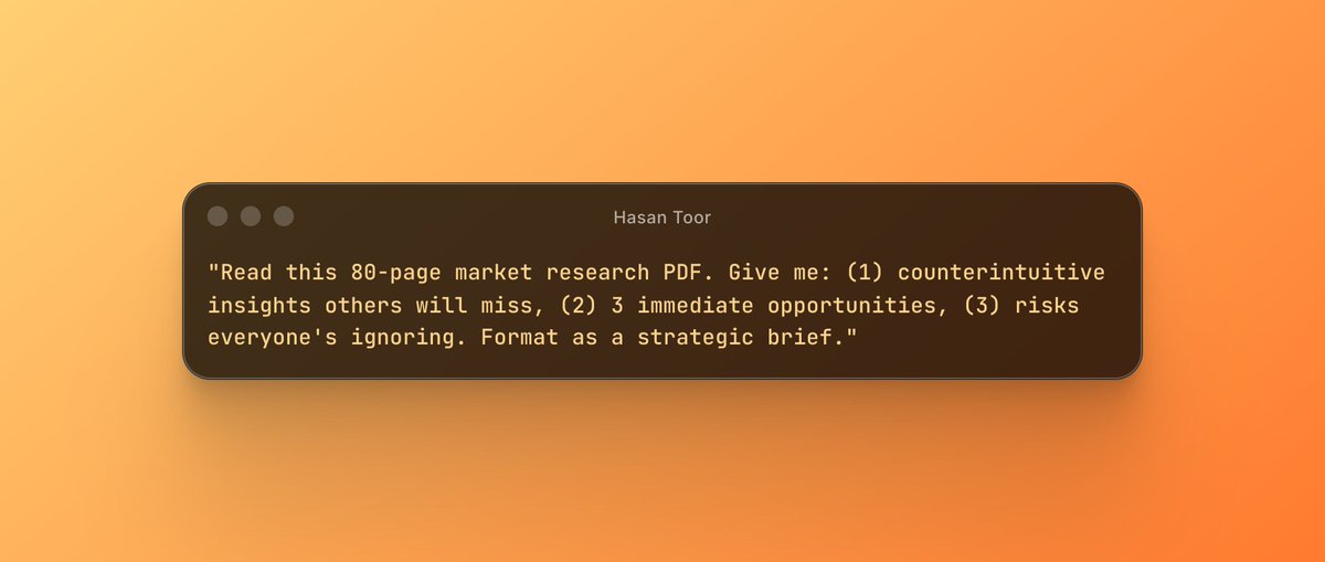 Prompt 2: "Read this 80-page market research PDF. Give me: (1) counterintuitive insights others will miss, (2) 3 immediate opportunities, (3) risks everyone's ignoring. Format as a strategic brief."