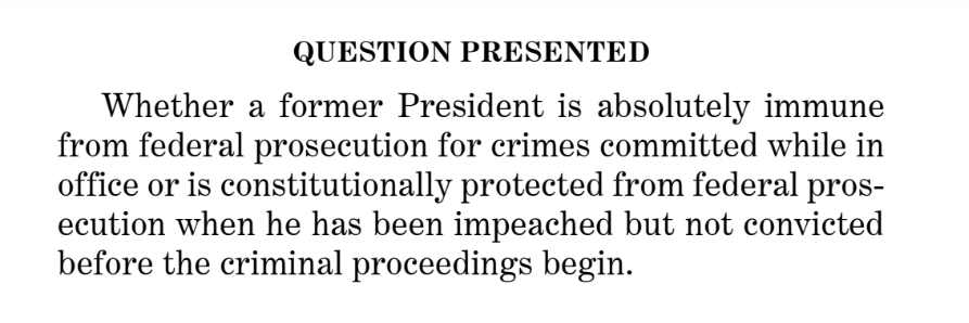 Here is the problem with this from Jack Smith's cert petition before SCOTUS asking for an immediate decision on complicated issues of presidential immunity from prosecution.