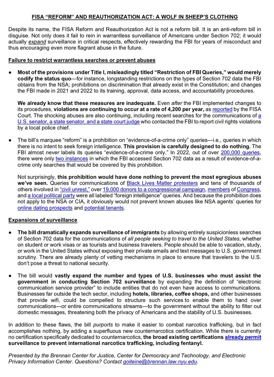 12. If you’re troubled by FISA 702, please share this thread & encourage members of Congress to (1) oppose the HPSCI bill, (2) advocate for the House Judiciary Committee bill, and (3) #StopTheNDAA, so as to prevent Congress from reauthorizing FISA 702 this week without reform.
