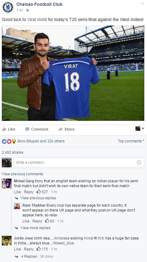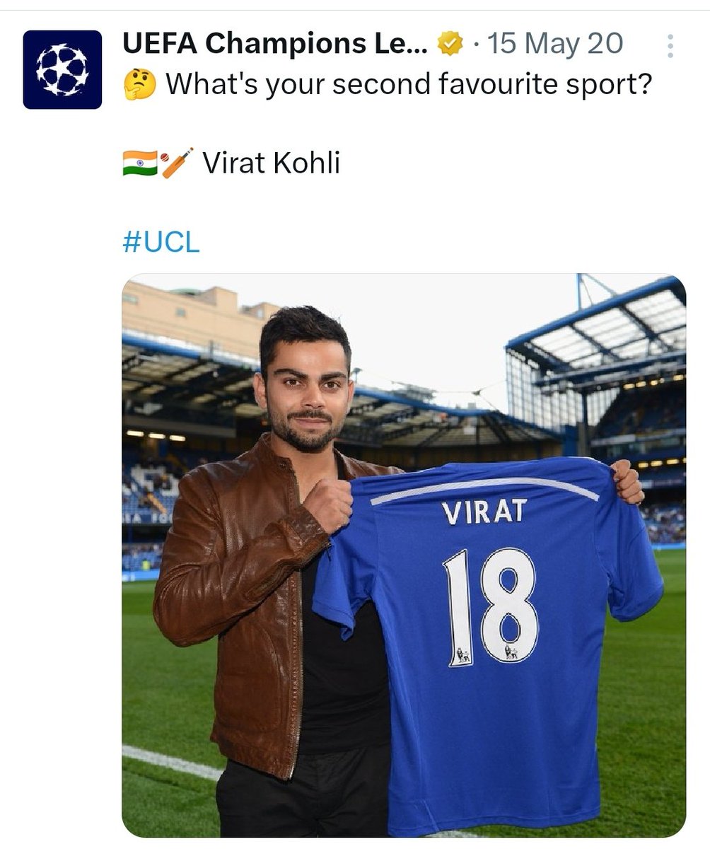 UEFA champions league on his second favourite sport and posted a picture of Virat Kohli holding Chelsea FC Jersey'.