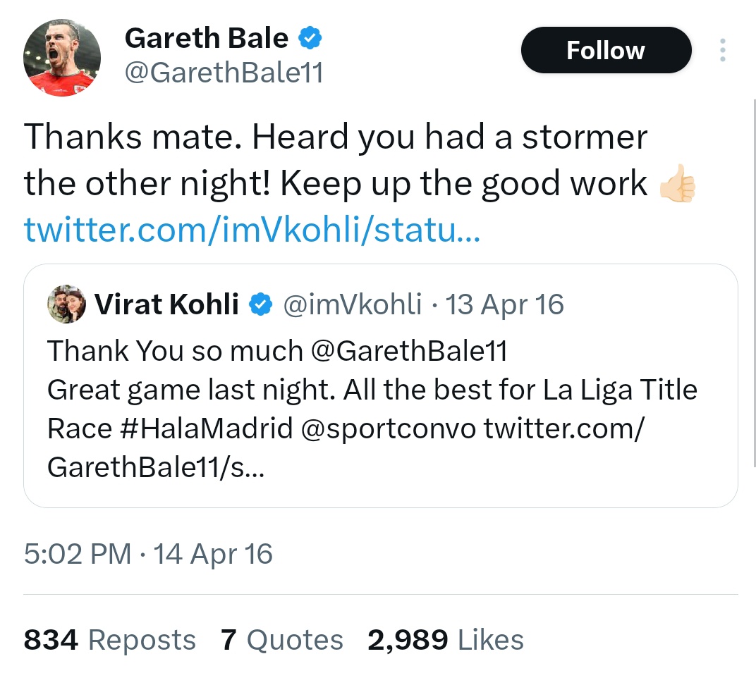 Real Madrid Legend 'Gareth Bale' on Virat Kohli.