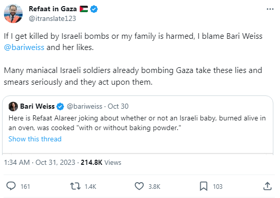 recently Bari Weiss put a kill target on Refaat Alareer, a Palestinian writer and reporter in Gaza, for daring to joke about the baby in oven hoax. The Israeli regime, whose members follow her every word, have now killed him. Bari Weiss killed Refaat Alareer
