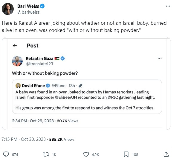 not only did Bari Weiss put a kill target on Refaat Alareer for daring to joke about the baby in oven hoax, which the regime itself debunked, but she hasn't even retracted it. Her post repeating the hoax and putting the kill target on Refaat is up now: