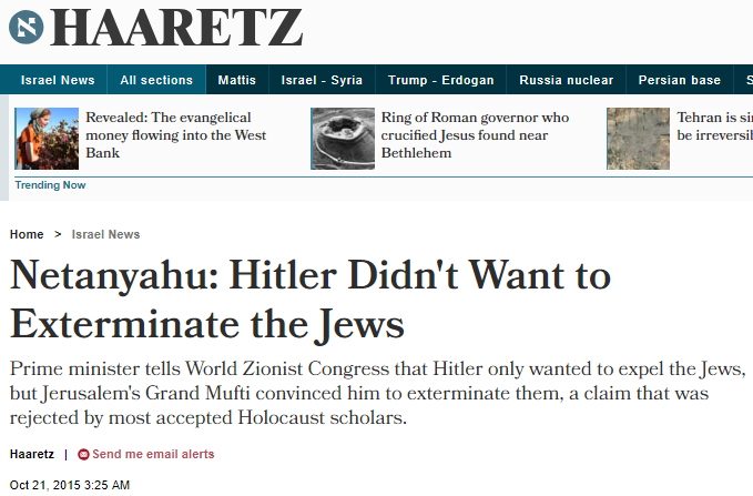 after Netanyahu said Hitler didn't want to exterminate Jews, scholars and the German government itself said he was lying. Germany accepted full responsibility for the Holocaust. Imagine how depraved you have to be to absolve Hitler and Germans against their own wishes