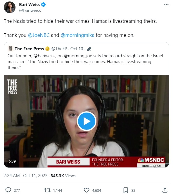 as I said at the time, none of the people who spread this hoax and in the case of Bari Weiss put kill targets on Palestinians in Gaza over it, will face any consequences for it. They're just moving on, living in their San Francisco penthouse suites