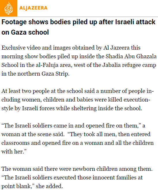 BREAKING: Israel is now massacring Palestinian women, children and babies sheltering in schools by shooting them execution-style at point blank range