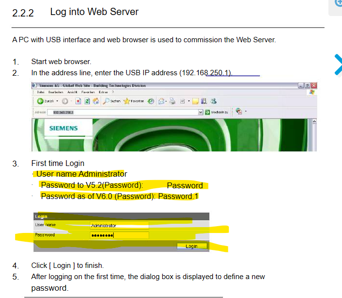 Pop over to a search engine, and search for "Siemens Synco OZW default password". I'm using Bing, for reasons.