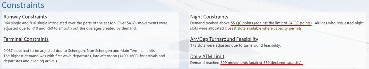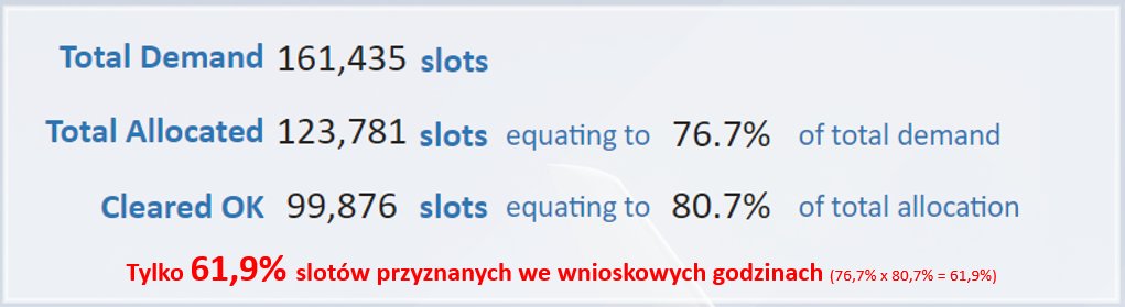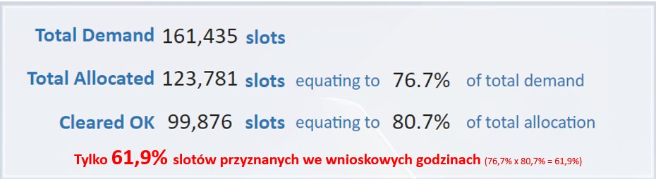 Tylko 61,9% slotów przyznanych zostało w dokładnie wnioskowanych godzinach. Reszta została przesunięta ze względu na brak przepustowości w deklarowanej porze