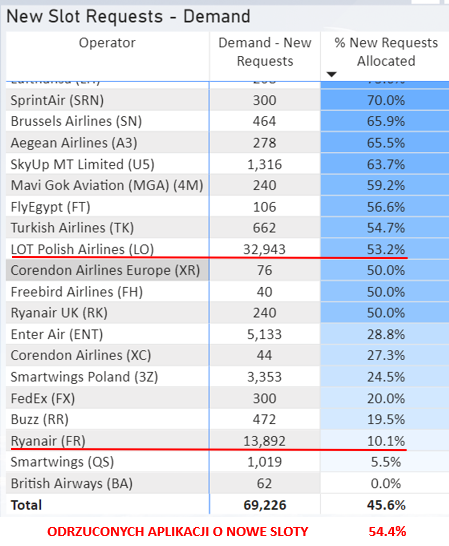 Linie zgłosiły zapotrzebowanie na 69,226 nowych slotów w sezonie Lato 2024. Przyznano 31,573 slotów, czyli tylko 45,6%