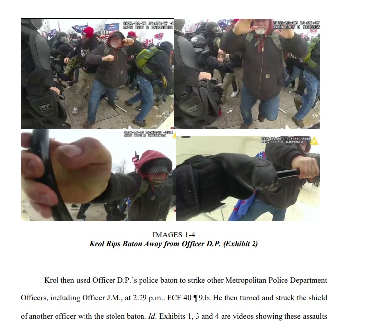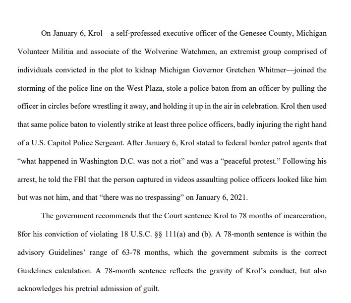 TODAY: Justice Dept will seek 78 months prison in Capitol riot case of Matthew Krol of Michigan, arguing he stole police baton and used it "to violently strike at least three police officers, badly injuring the right hand of a US Capitol Police Sergeant"